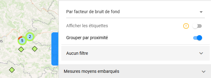 L'affichage par défaut présente les points dégroupés. Les points de prélèvement peuvent être regroupés (i.e. clusterisés) lorsqu'ils sont colocalisés ou proches les uns des autres. Le regroupement est réalisé à l'aide du bouton à bascule Grouper par proximité dans le menu principal.