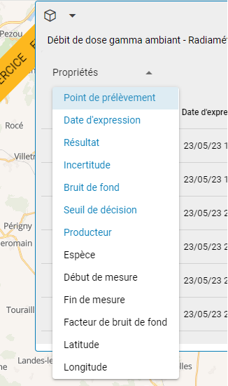 La vue tabulaire est accessible à partir de la vue graphique. Elle donne accès à toutes les valeurs des graphes dans des tableaux dont les colonnes par défaut sont : Point de prélèvement, Date d'expression, Résultat, Incertitude, Bruit de fond, Seuil de décision etProducteur.