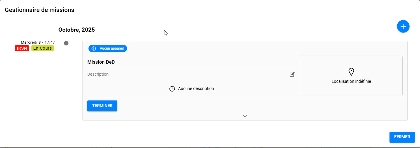 Cette fonctionnalité fait apparaitre le panneau de gestion des missions. Dans ce panneau, il est possible de créer des missions.