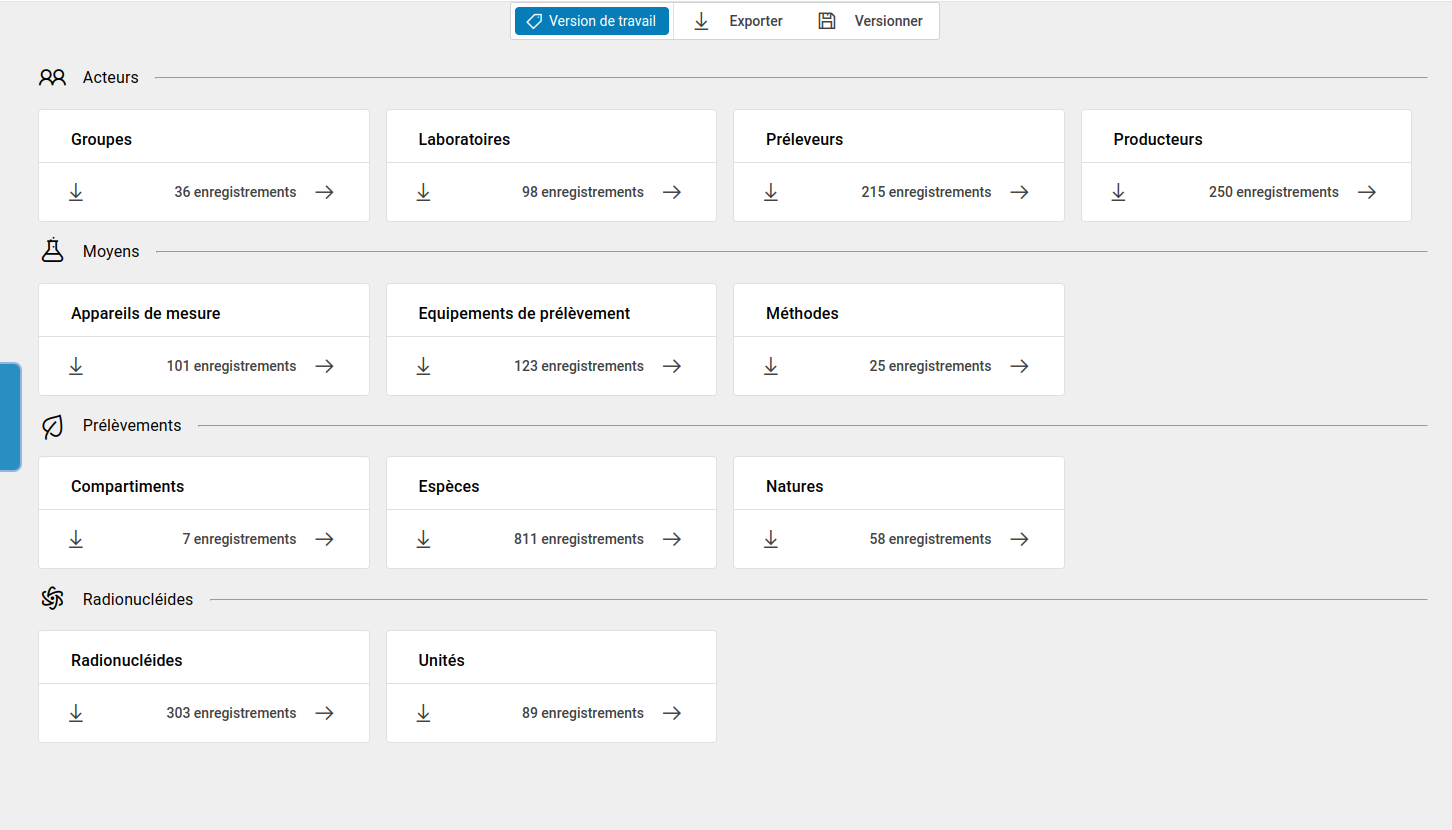 Le référentiel peut être versionné et chaque évènement est lié à une version du référentiel. Il peut être exporté dans sa globalité mais chaque table peut également être téléchargée indépendamment.